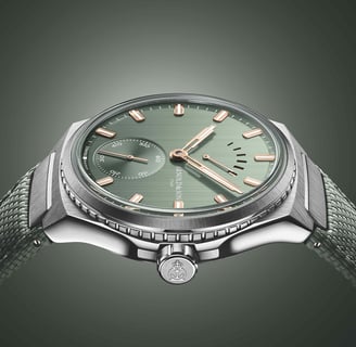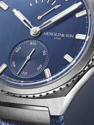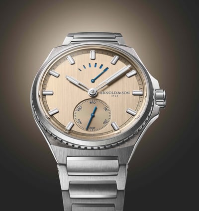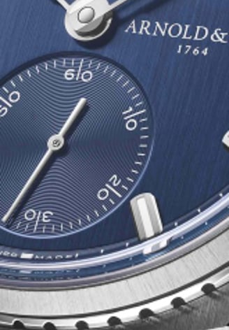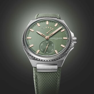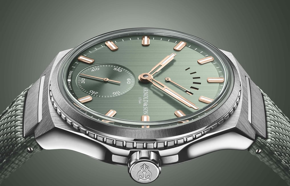 Three limited edition dial colors are available: a sandy golden "Kingsand" tone, ocean blue, and fern green - each referencing landscapes in Arnold's birthplace of Cornwall. Luminescent coatings ensure nighttime legibility.