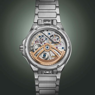 The self-winding caliber operates at a modern 4Hz beat rate and amasses a 60-hour power reserve while showcasing haute horology finishing traditions. This includes chamfered bridges with Arnold & Son's signature 'Rayons de la Gloire' Geneva Stripe motif. Each step from initial design to final assembly and casing occurs in-house at their manufacture in La Chaux-de-Fonds.