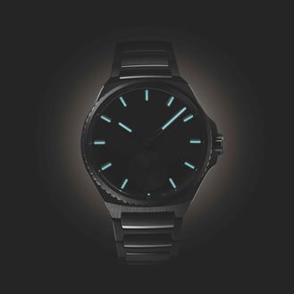 The dials are matched with an integrated titanium bracelet made of curved, domed links that seamlessly blend brushed and polished surfaces for a flowing wrist presence. A bonus rubber strap is included, secured by a screw-down crown that provides 100 meters of water resistance.