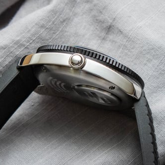 The case measures 36mm in diameter and is constructed from stainless steel with a combination of polished and circular brushed finishes. Topping the case is a friction-fit aluminum ring marked with an elapsed time scale typically used for timing laps or races.