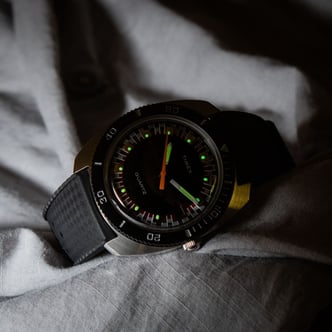 In a nod to the original model's acrylic crystal, the Velocity Reissue uses domed acrylic for its transparent cover. Behind this sits a dial with a checkered pattern along the outer perimeter reminiscent of a racing flag waving at the finish line.
